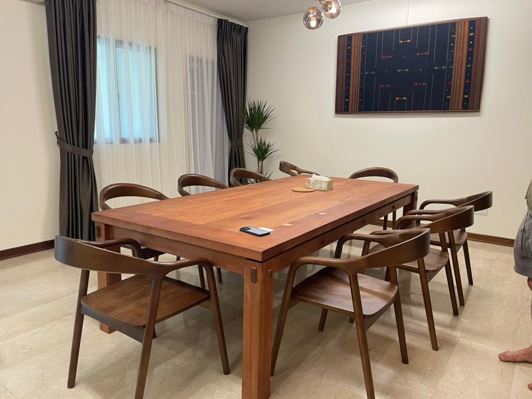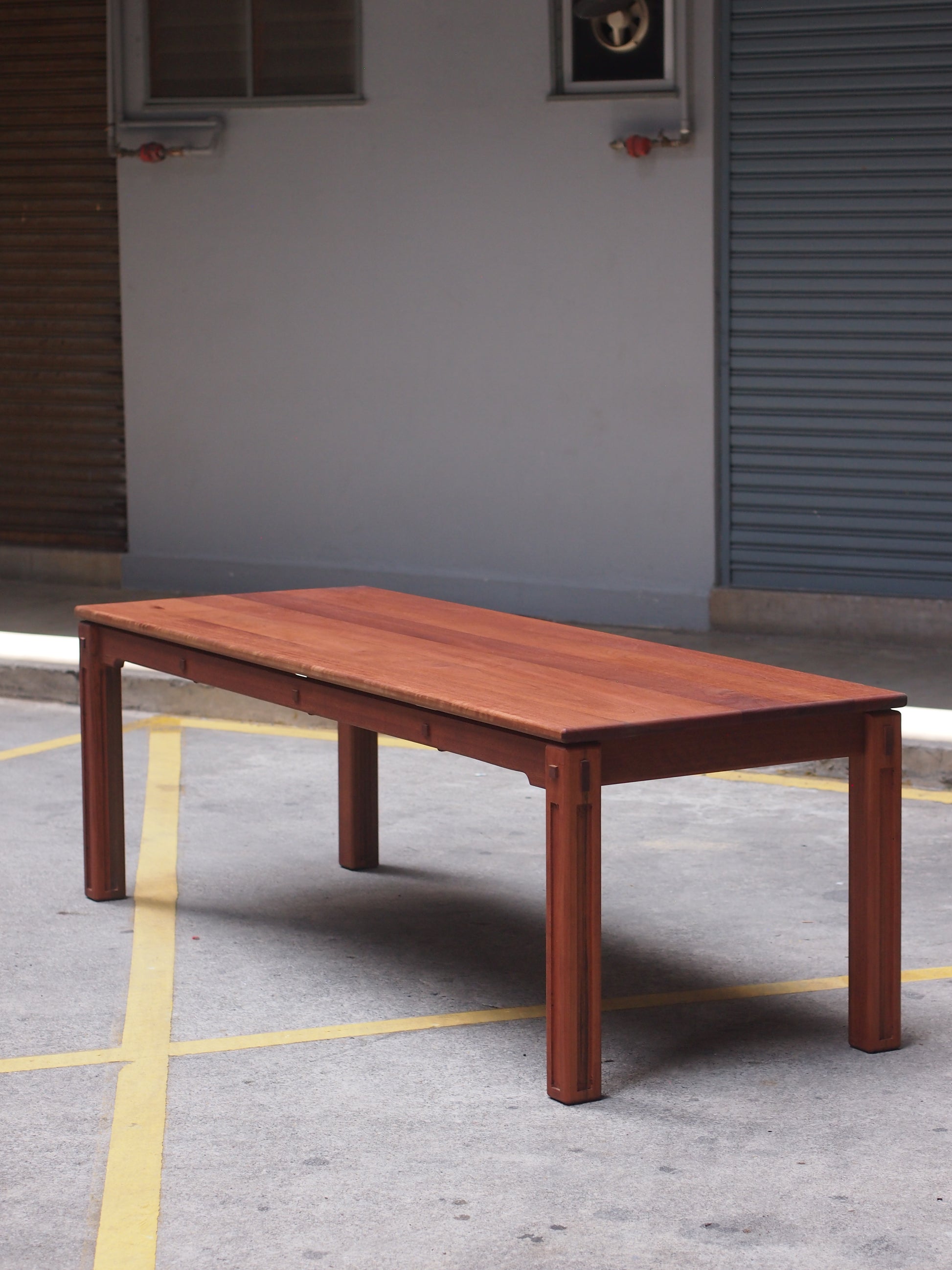 Beyond the visual interest of a disconnected and floating top, the float demonstrates the thickness and gravitas of a solid wooden top. These beefy floating tables straddle the methods of furniture making and timber framing for building. The keys are the large interlocking through mortise and tenon joineries at the leg posts. The proud tenons, typically a demonstration of precise joint-making doubles as subtle ornamental flair.
